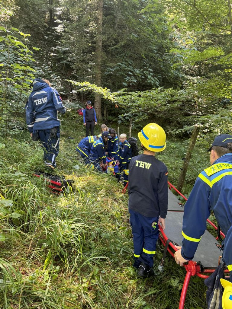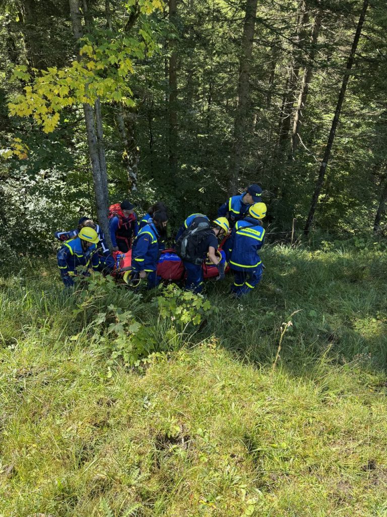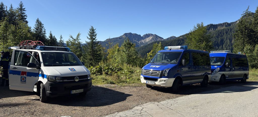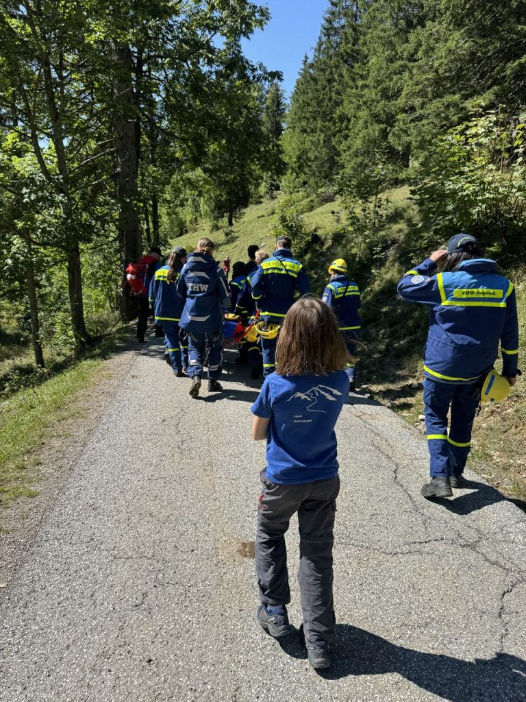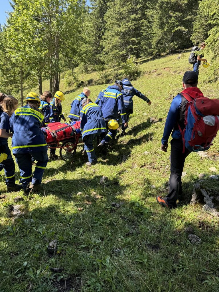 Bereits im Juli besuchten Ehrenamtliche der Bergwacht München die Gruppenstunden der drei Jugendgruppen. Hier durften die Jugendlichen nach einer kurzen Einführung die Gebirgstrage und den Bergesack praktisch anwenden. Dadurch waren bereits die ersten Grundlagen für den späteren Gegenbesuch geschaffen. Am 06.09.2025 war es dann soweit und um 8 Uhr verließen die Junghelfer:innen den Ortsverband in Richtung Spitzingsee zur Diensthütte „Maxlrainer“ der Bergwacht München. Dort angekommen konnten sich alle noch einmal mit dem Material vertraut machen, bevor es dann auch schon an die Einsatzübung ging. Ein Wanderer war am Rand einer nahegelegenen Almwiese umgeknickt und konnte nicht mehr selbständig den Rückweg antreten. In drei kleinere Gruppen aufgeteilt konnten die Jugendlichen den Patienten ausfindig machen. Mittels Gebirgstrage und Bergesack konnte der Verletzte zurück zur Hütte gebracht werden. Nach dem Mittagessen wurde an drei Stationen das eigene Wissen zu Erster Hilfe und dem Sichern von Personen an steilen Hängen erneuert und vertieft. Im Anschluss ging es zurück nach München, wo gegen 18 Uhr der Tag beendet wurde.