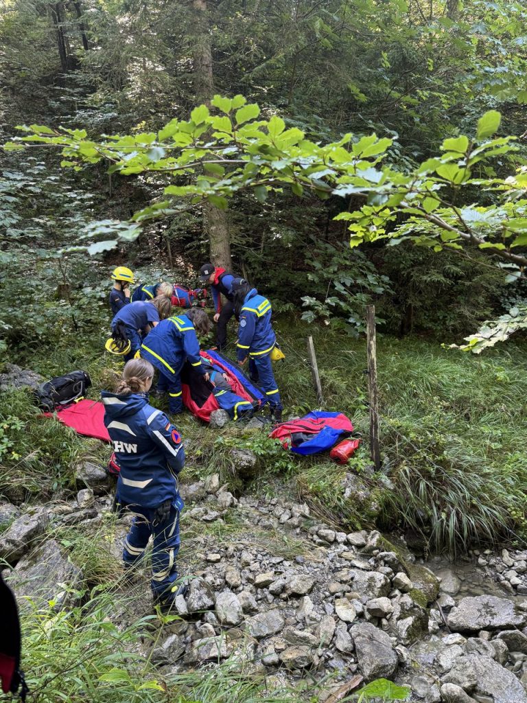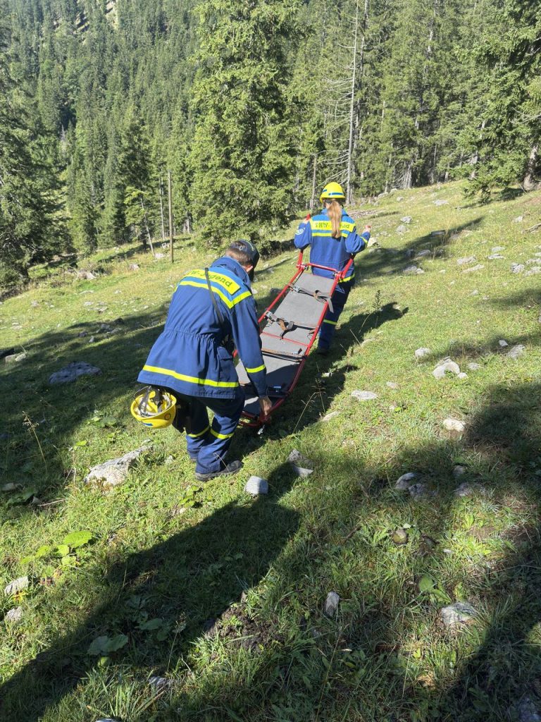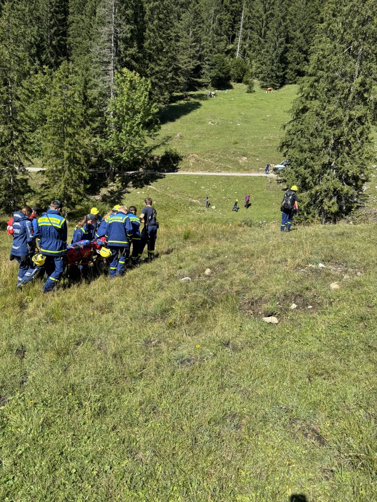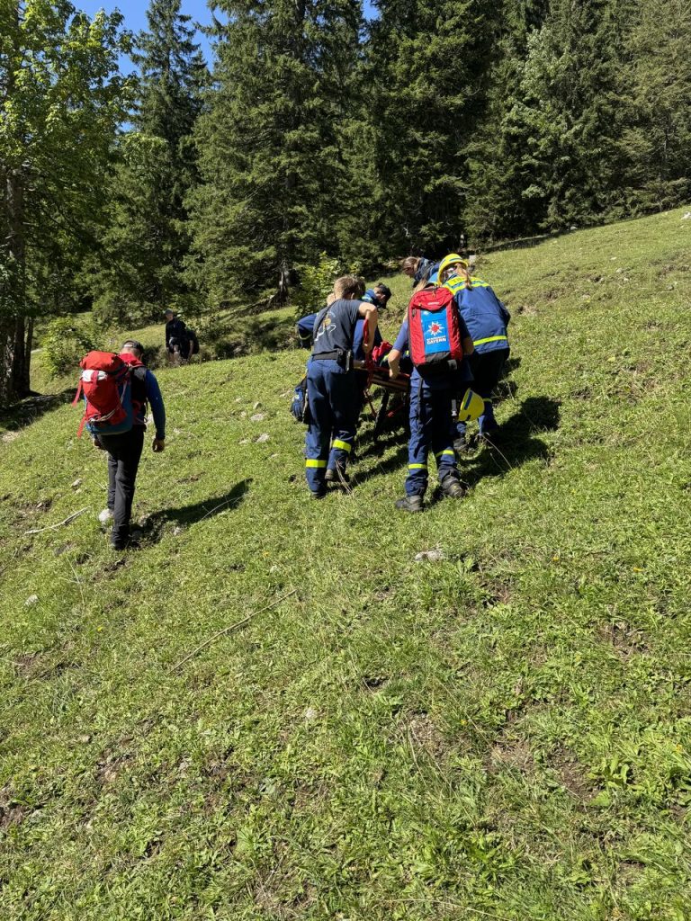Bereits im Juli besuchten Ehrenamtliche der Bergwacht München die Gruppenstunden der drei Jugendgruppen. Hier durften die Jugendlichen nach einer kurzen Einführung die Gebirgstrage und den Bergesack praktisch anwenden. Dadurch waren bereits die ersten Grundlagen für den späteren Gegenbesuch geschaffen. Am 06.09.2025 war es dann soweit und um 8 Uhr verließen die Junghelfer:innen den Ortsverband in Richtung Spitzingsee zur Diensthütte „Maxlrainer“ der Bergwacht München. Dort angekommen konnten sich alle noch einmal mit dem Material vertraut machen, bevor es dann auch schon an die Einsatzübung ging. Ein Wanderer war am Rand einer nahegelegenen Almwiese umgeknickt und konnte nicht mehr selbständig den Rückweg antreten. In drei kleinere Gruppen aufgeteilt konnten die Jugendlichen den Patienten ausfindig machen. Mittels Gebirgstrage und Bergesack konnte der Verletzte zurück zur Hütte gebracht werden. Nach dem Mittagessen wurde an drei Stationen das eigene Wissen zu Erster Hilfe und dem Sichern von Personen an steilen Hängen erneuert und vertieft. Im Anschluss ging es zurück nach München, wo gegen 18 Uhr der Tag beendet wurde.