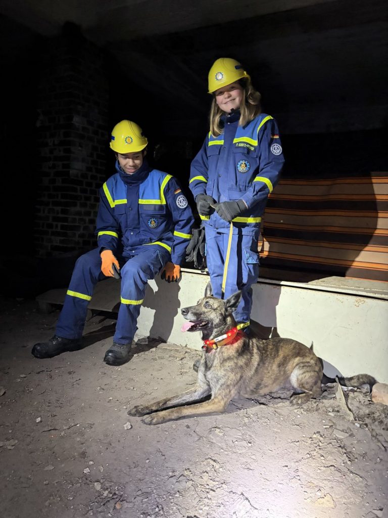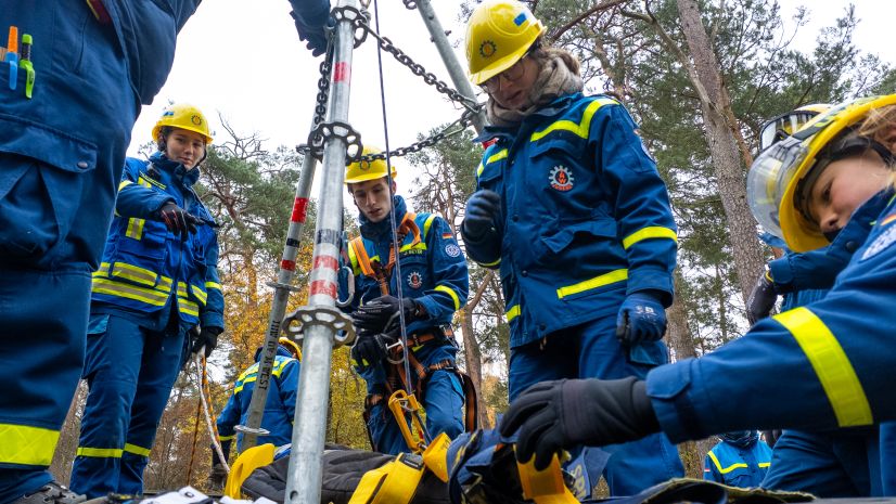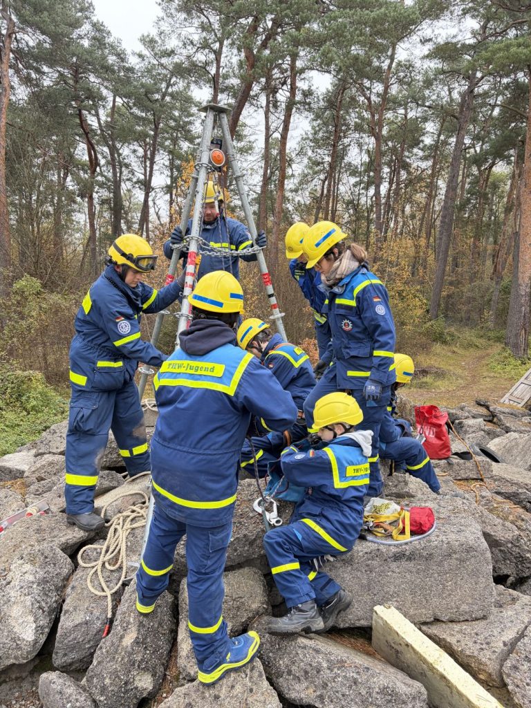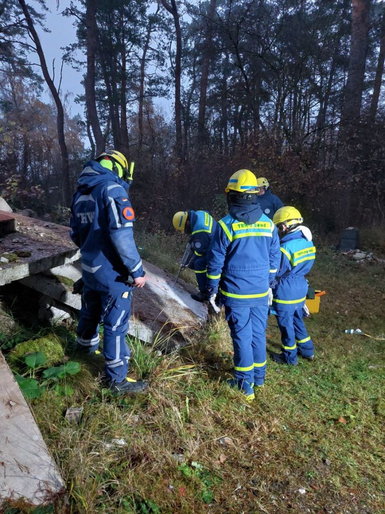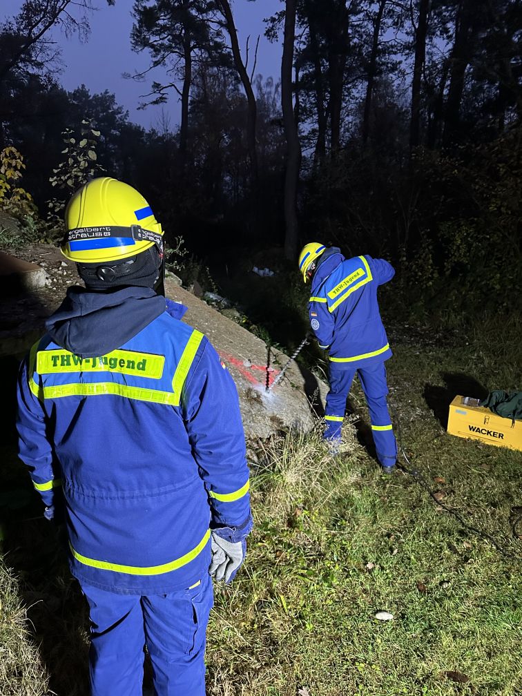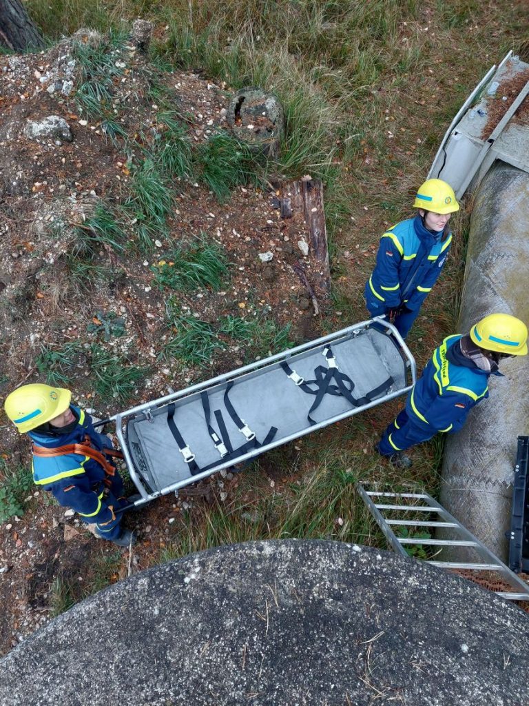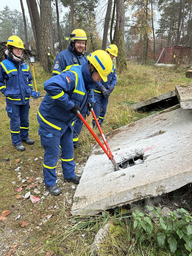 Nach einer kurzen Nacht wurden die Jugendlichen gegen 5 Uhr morgens durch vorher verteilte Übungspiepser geweckt. In zwei Gruppen mussten nun verschiedenen Einsatzszenarien abgearbeitet werden. Der eine Teil der Junghelfer:innen stützte die Decke eines „einsturzgefährdeten“ Gebäudes mittels Baustützen ab. Parallel mussten mehrere vermisste Personen aus einem teilweise eingestürzten Haus gerettet werden, wozu unter anderem ein Wanddurchbruch benötigt wurde. Im Anschluss konnten alle Jugendlichen beim Frühstück eine wohlverdiente Pause machen, bevor gegen 10 Uhr die nächste Übung begann. Die erste Gruppe musste nun vorher versteckte Übungspuppen aus einem unterirdischen System an Kriechgängen mittels Rollgliss, einem Rettungs- und Abseilgerät für Personen, befreien. Zeitgleich wurde eine weitere Person aus einem höhergelegenen Baucontainer mit einer Seilbahn auf den Boden zurückgebracht.