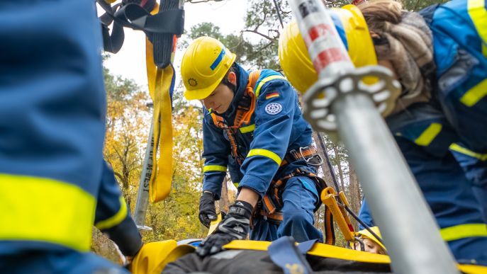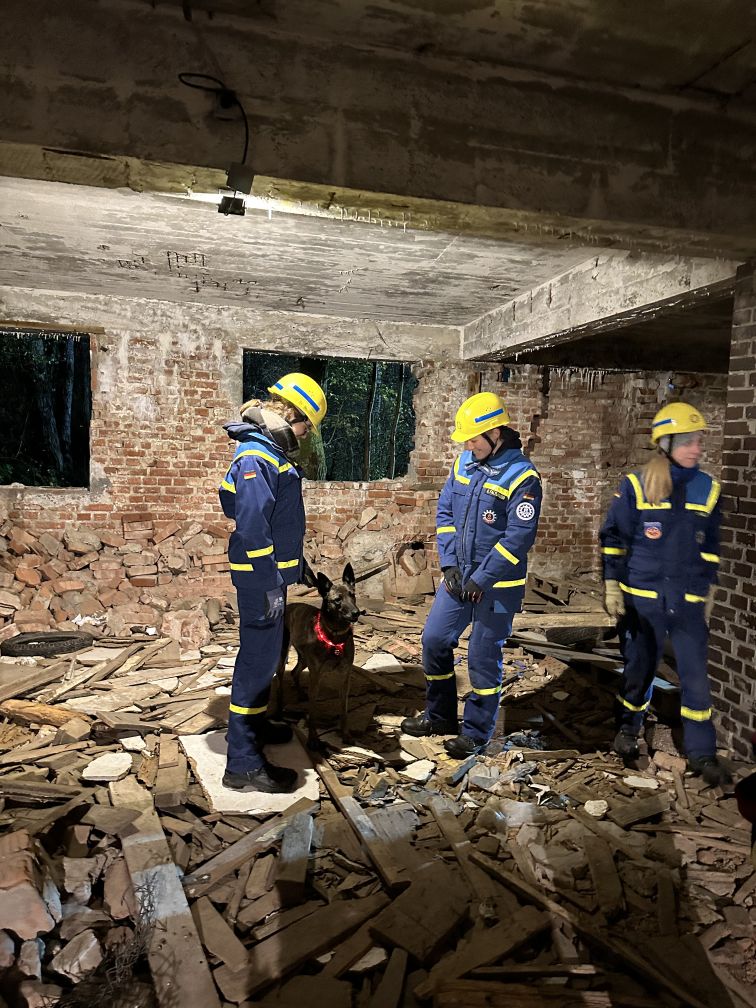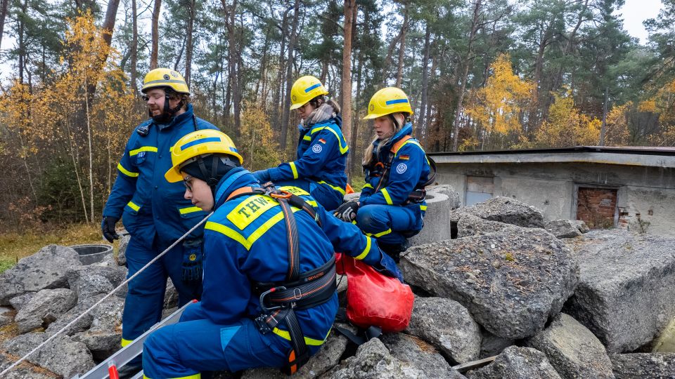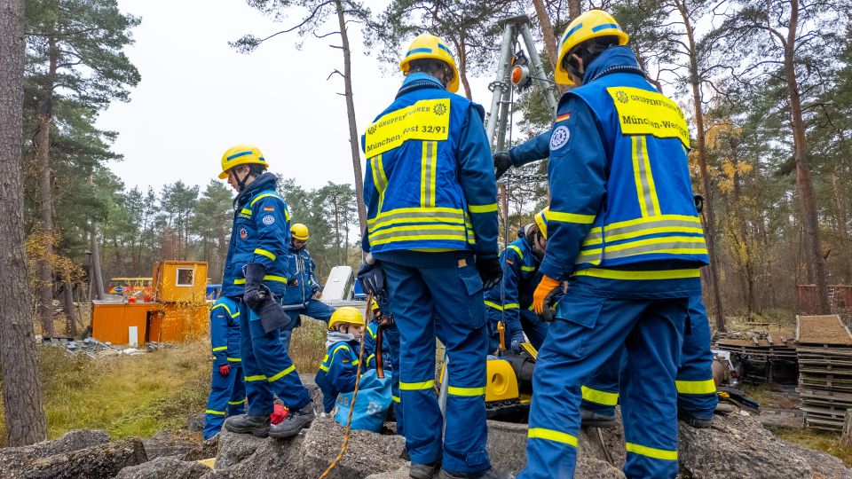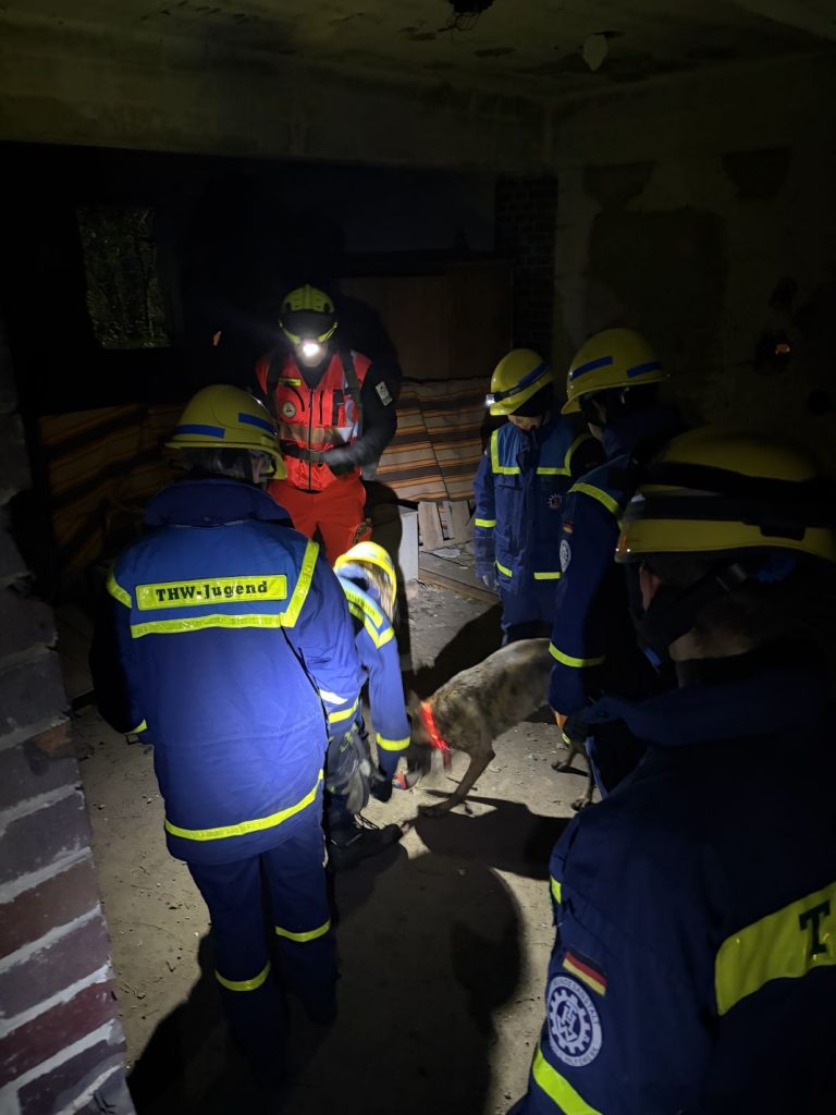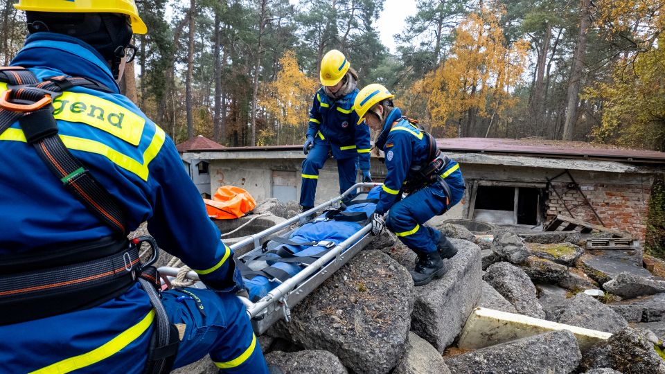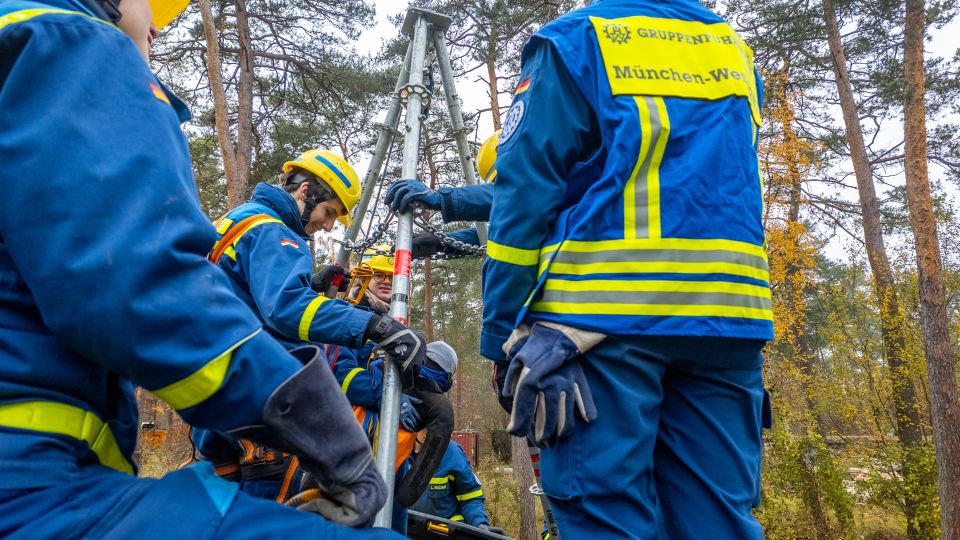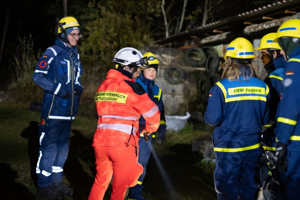 Nach einer kurzen Nacht wurden die Jugendlichen gegen 5 Uhr morgens durch vorher verteilte Übungspiepser geweckt. In zwei Gruppen mussten nun verschiedenen Einsatzszenarien abgearbeitet werden. Der eine Teil der Junghelfer:innen stützte die Decke eines „einsturzgefährdeten“ Gebäudes mittels Baustützen ab. Parallel mussten mehrere vermisste Personen aus einem teilweise eingestürzten Haus gerettet werden, wozu unter anderem ein Wanddurchbruch benötigt wurde. Im Anschluss konnten alle Jugendlichen beim Frühstück eine wohlverdiente Pause machen, bevor gegen 10 Uhr die nächste Übung begann. Die erste Gruppe musste nun vorher versteckte Übungspuppen aus einem unterirdischen System an Kriechgängen mittels Rollgliss, einem Rettungs- und Abseilgerät für Personen, befreien. Zeitgleich wurde eine weitere Person aus einem höhergelegenen Baucontainer mit einer Seilbahn auf den Boden zurückgebracht.